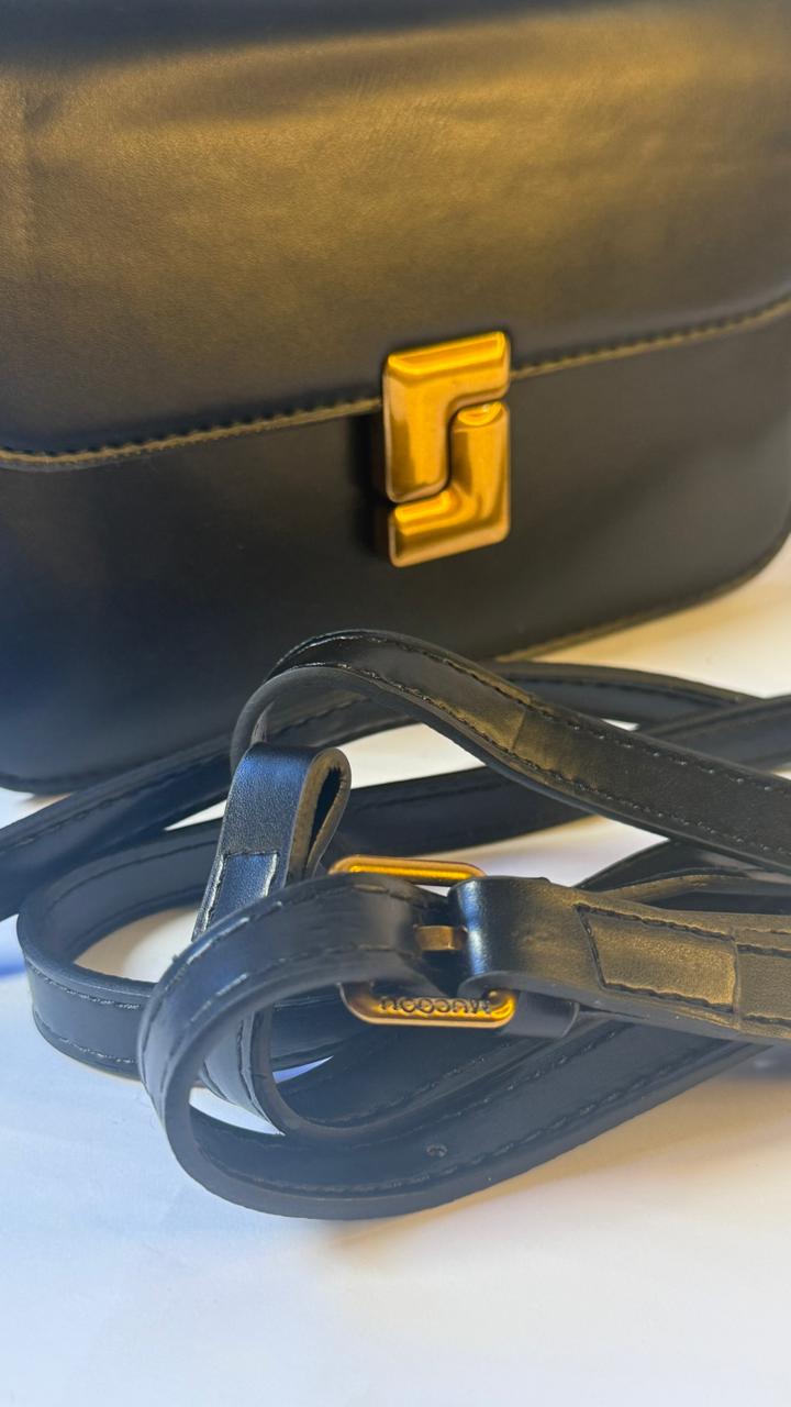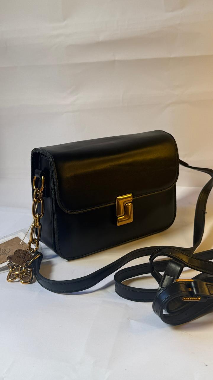 The black leather handbag features a distinctive gold clasp and chain strap, giving it a sleek and sophisticated look. The gold teddy bear charm adds a touch of whimsy and personality to the overall design.