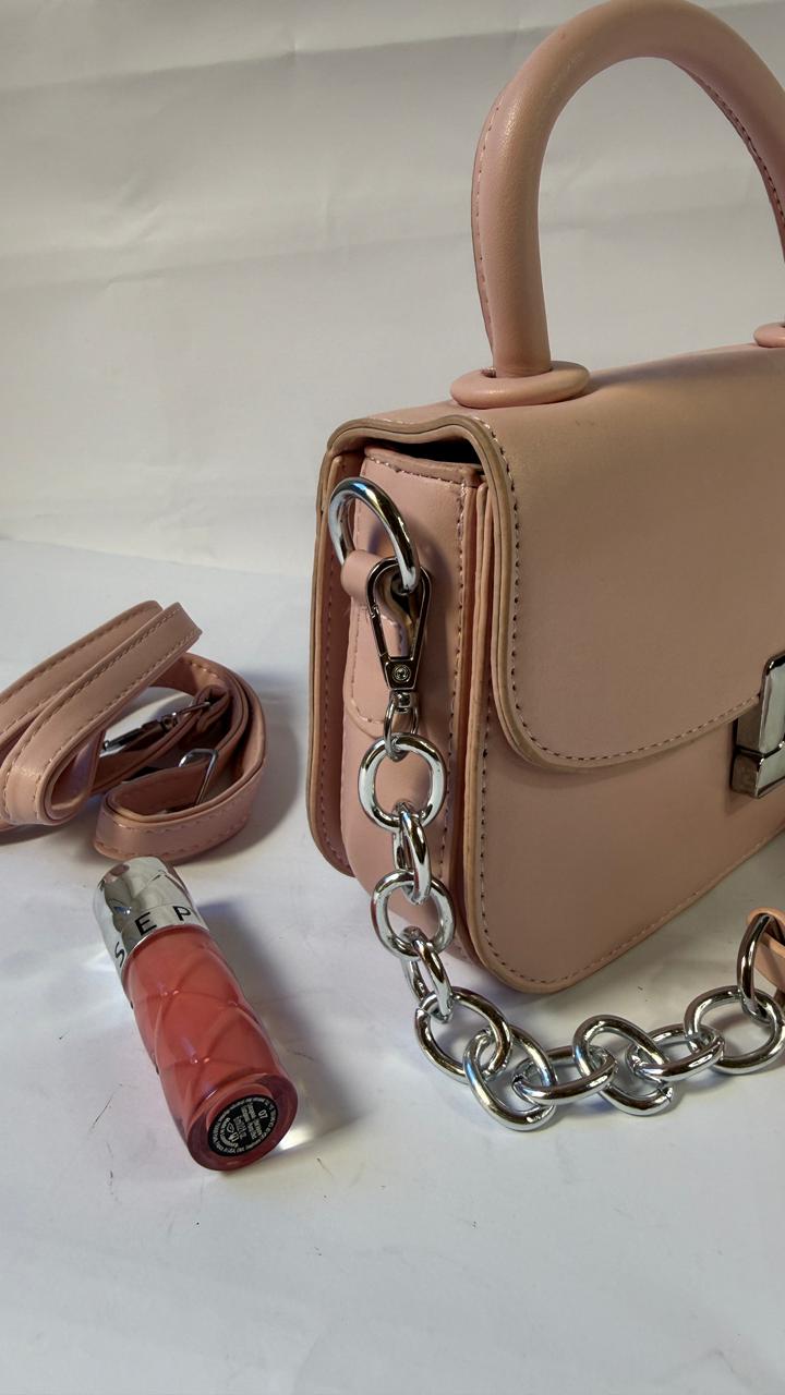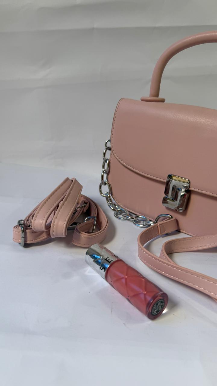 A pink handbag and matching strap create a cohesive and stylish look.