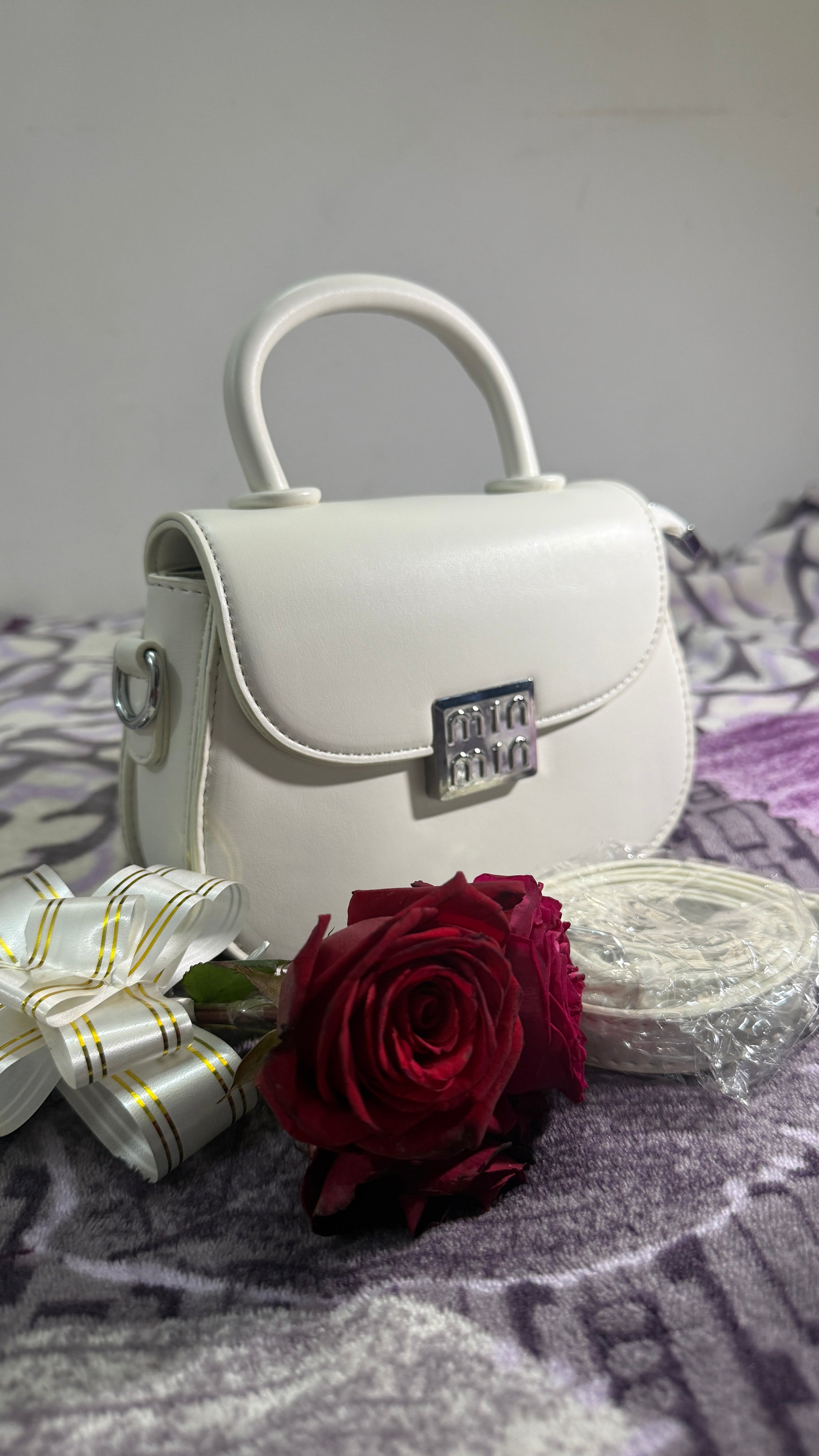 Perfect your style with our stylish off-white mini top-handle bag featuring a tuck-lock flap closure for a secure finish